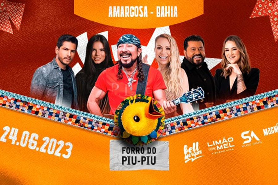 A edição de 2023 do Piu-Piu já anunciou a grade de atrações para animar a festa, o cantor Bell Marques e as bandas Magníficos e Limão com Mel – que irão levar todo o tradicional forró para o clima junino que vai invadir Amargosa, e a cantora Solange Almeida, que levará os maiores sucesso de sua carreira para o palco do evento.